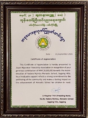 2025年3月28日に発生したミャンマー大地震に際して、被災者を支援するための義援金を募ったところ、会員、親族、友人等から浄財416万円の義援金が集まりました。義援金は、30万円相当の食料・水・薬品等の「緊急支援」をミャンマー鉄道の被災者に、残る383万円をミャンマー工業会Myanmar Industries Association-MIAの協力を得て、被害の大きかったザガイン市内の被災者の「生活支援」に贈与しました。MIAは、当協会からの協力依頼を受けて、10人のTask Forceを設置し、8月末に現地で事前調査を実施。その結果、義援金を下記の4つの生活支援プログラムに効果的に使用することを決定・実施しました。いずれの被災者も、当協会からの支援に大変感謝しているとの謝意を表明し、感謝状が贈られました。