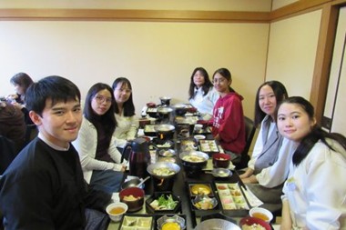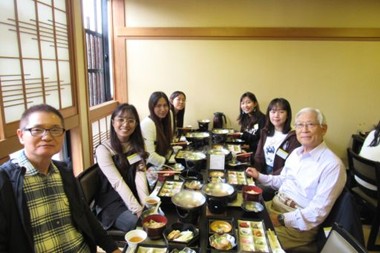 当日の参加者はミャンマー留学生9名(ハウディ日本語学校、大阪女学院大学、立命館大学、龍谷大学)、日本 人学生3名(京都大学、立命館大学)、当協会員2名の計 14 名でした。11:30 東大門前に全員 が集合し、門前にある交流会場の湖国料理店「洗心寮」へと向かいました。同店は瀬田川に面した昭和2年創業の店 で、全員2階の特別席に案内されました。テーブルにずらりと並んだ豪華な湖国料理に日・緬学生さん達は興味 津々で、直ぐに思い思いの席に附きました。珍しい湖国料理を食べながら暫し歓談し、その後は自己紹介で、大学生活や日本への想い、将来の夢等を楽しく語り合い交流を深めました。
