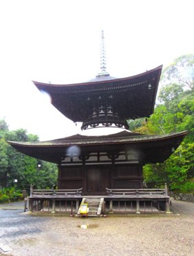この多宝塔は天然記念物の硅灰石の岩盤上に建てられており、1194 年に源頼朝の寄進により建立された鎌倉時代の国宝で日本最古の多宝塔です。 多宝塔を後に一路スタート地点の東大門へと向かいました。予定より早い14:15に東大門に到着。降り続く雨の中、ミャンマー語も交えながら熱心に説明をしていただいたガイドさんに別れを告げ、門前の「」で雨宿りも兼ねて小休止を。ここで主催者から参加者全員にお土産の「叶匠寿庵・」が手渡されました。コシのある羽二重餅に滋賀産のきなこ、抹茶をまぶした黒蜜添えの銘菓で、参加者は大喜びで受け取り、14:30、楽しかった交流会と石山寺拝観に感謝し再会を誓ってそれぞれの帰路につきました。